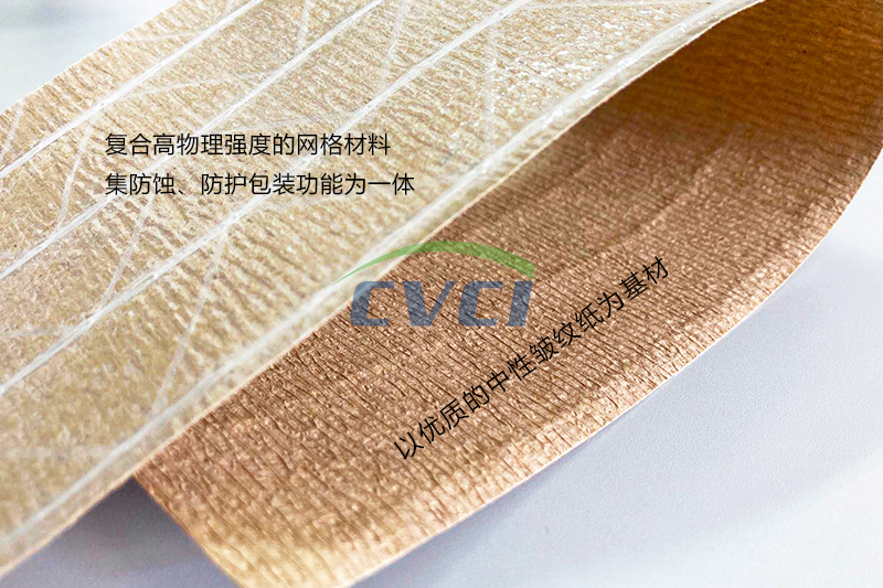 加網(wǎng)復(fù)合紙以優(yōu)質(zhì)的中性皺紋紙為基材,按結(jié)構(gòu)和特性分為皺紋加網(wǎng)復(fù)合紙和阻隔型皺紋加網(wǎng)復(fù)合紙。產(chǎn)品可添加氣相緩蝕劑,制作成加網(wǎng)型復(fù)合氣相防銹紙。